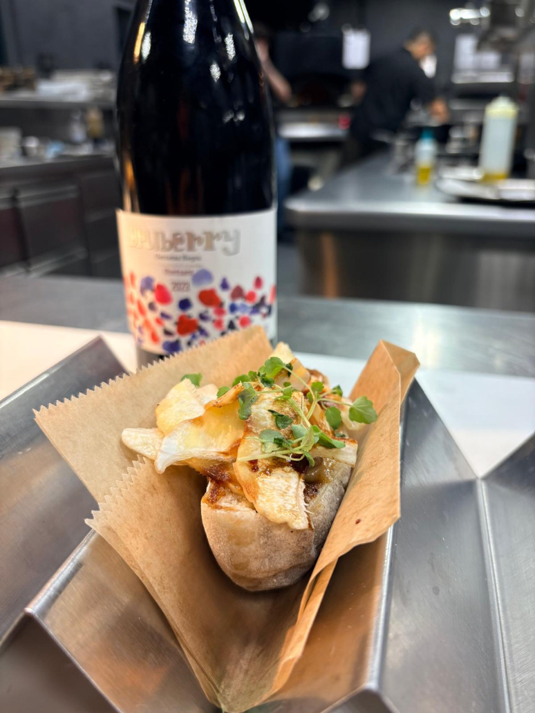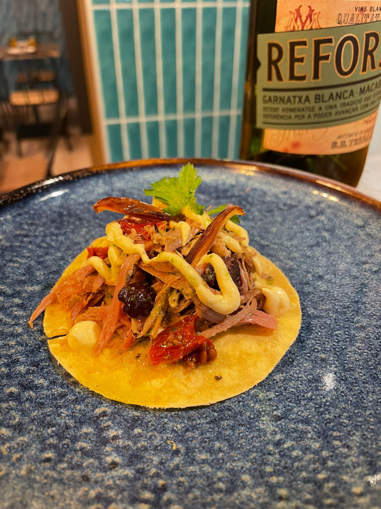 “Tortita blat de moro” amb ragú de xai, tomàquets confitats olivada salsa de yogur i tahin amb suc del rostit..!!!