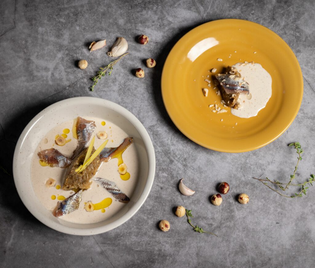 Sardines fumades i tàrtar d’albergínia amb ajoblanco d’avellana.