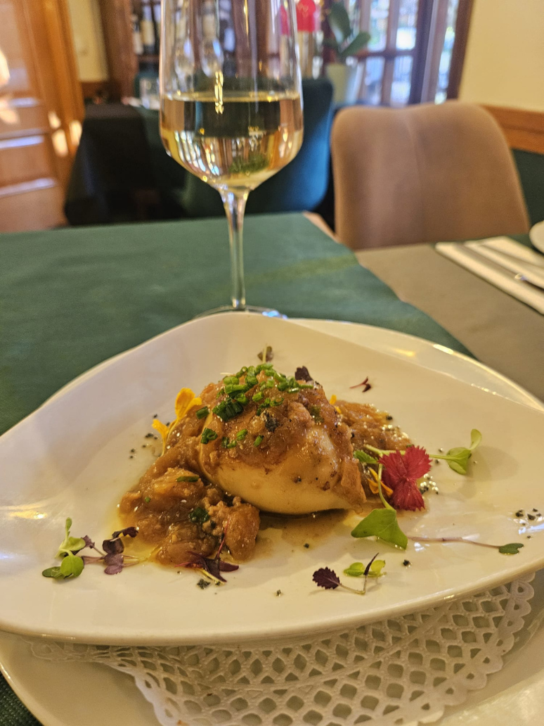 Calamar relleno de carne y cebolla caramelizada .