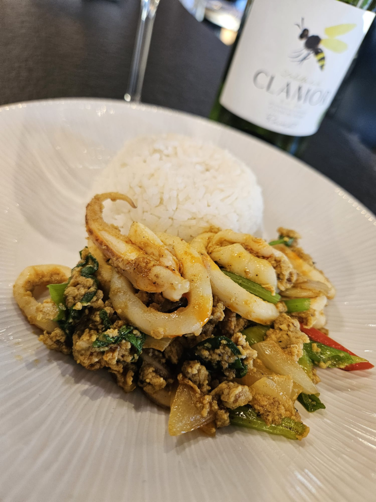 Pad Pom Kari: Calamars saltejats amb vedures, ou i curri.